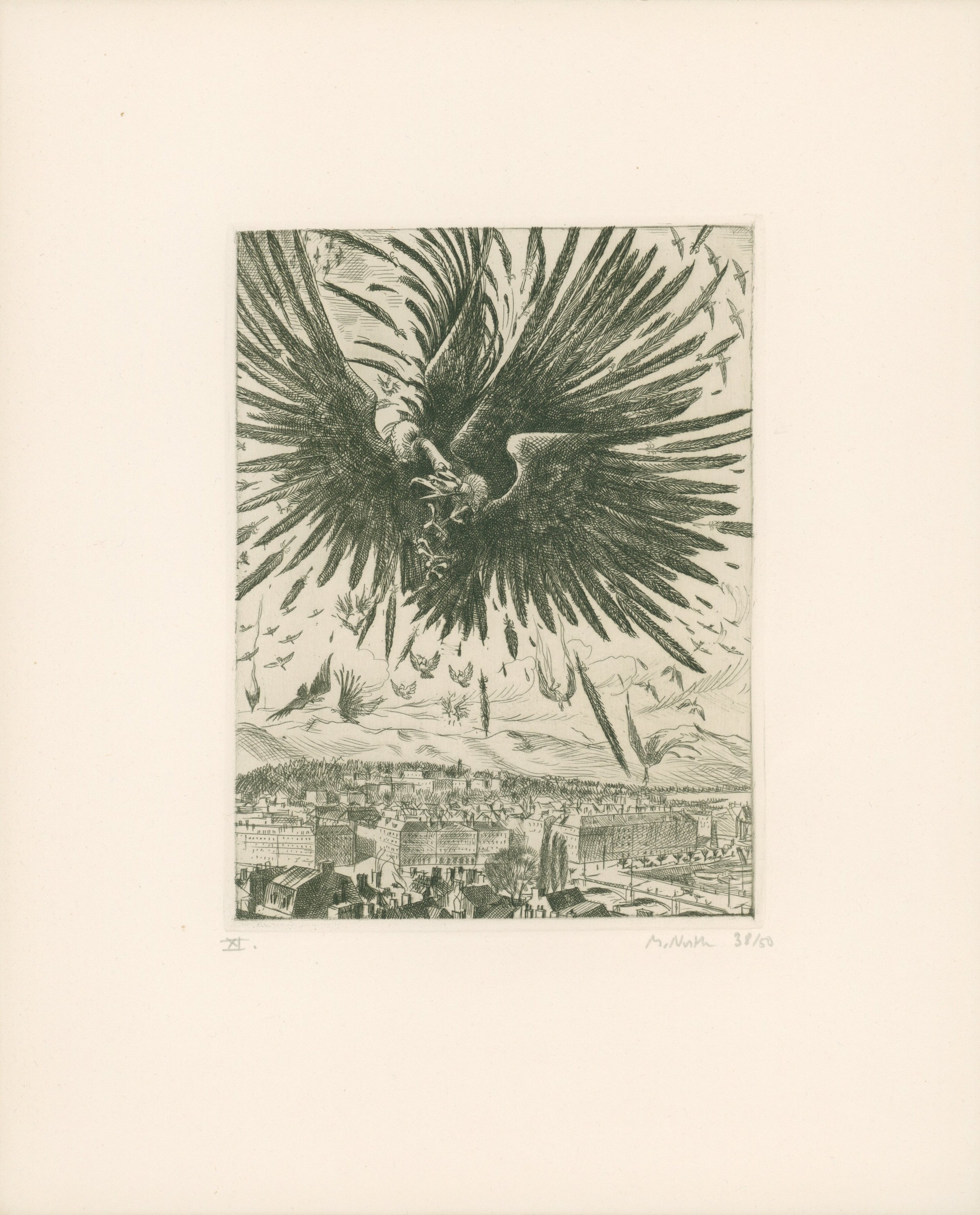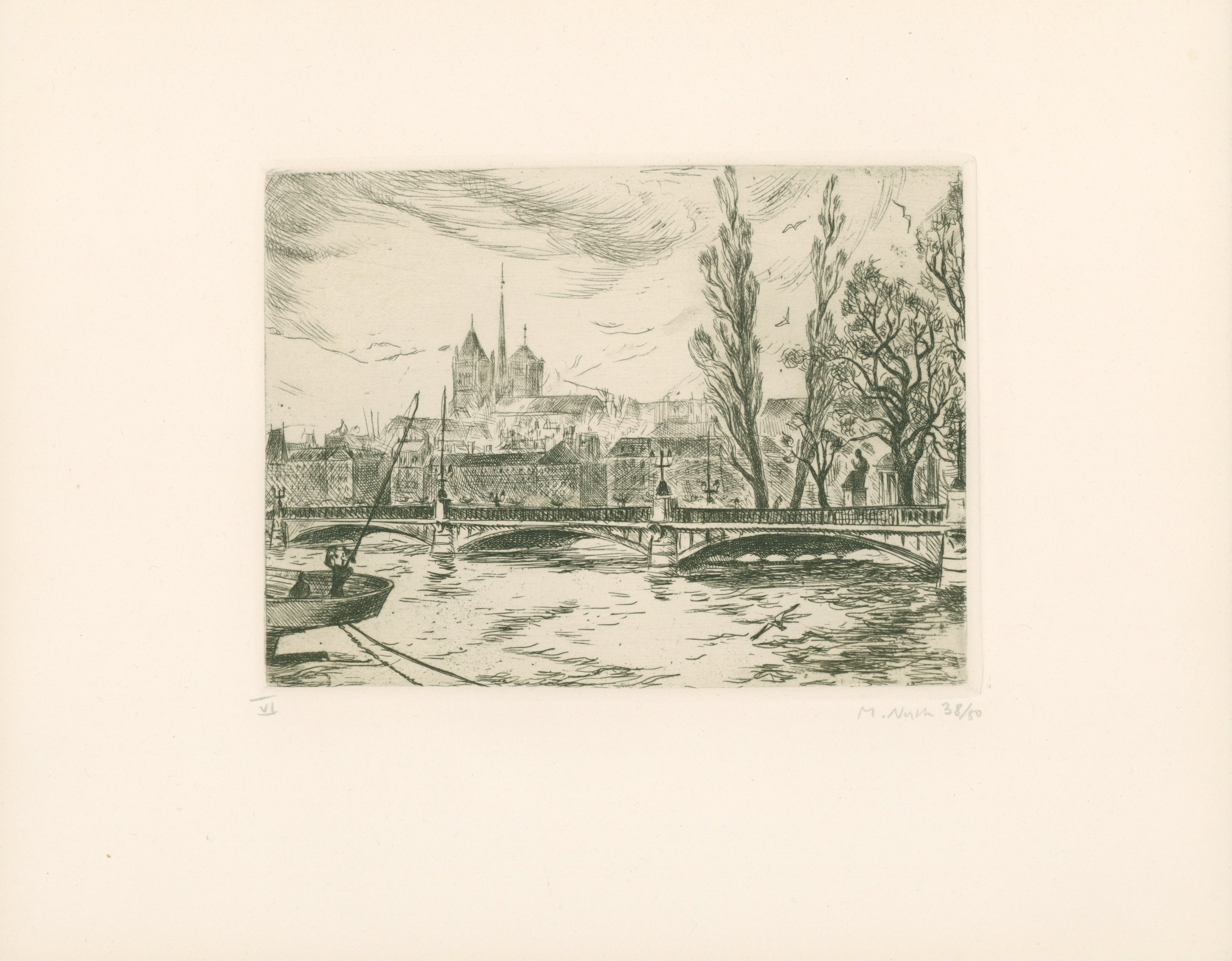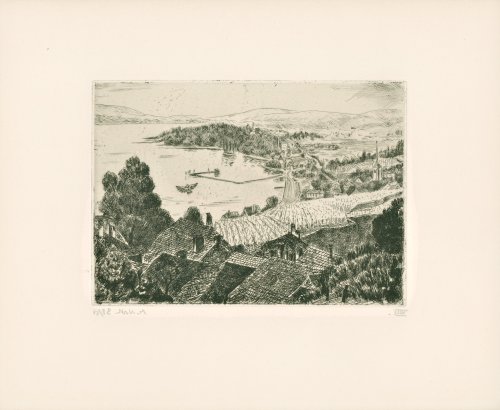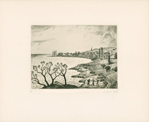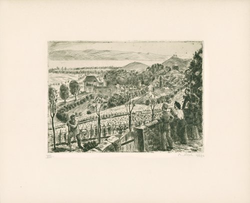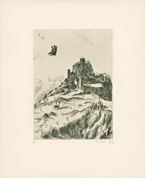 1941 "Paysages gravés à l'eau-forte pour douze fables de Jean de La Fontaine." "12 handwritten signed and numbered original etchings in loose sheets with tissue paper. In half-canvas folder. Number 38 of 50 copies. These etchings were printed at Orell Füssli in Zurich.