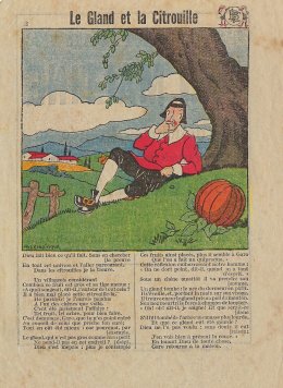 1933 Two handbills of La Fontaine fables illustrated by M. Lemainque: 2P and "Le Gland et la Citrouille." 5⅜" x 7⅜". Printed by Louis Bellenand et Fils, Fontenay-aux-Rises, Advertisement on verso. €2.59 each from la fee chinette through Ebay, Sept., '22.