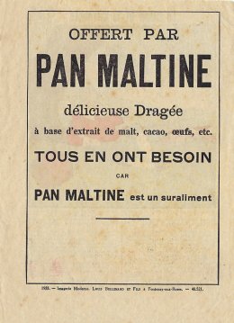 Dragees are candy-like. Would we call them "dietary supplements" now, 90 years later? Both of Lemainque's illustrations are pointed and engaging. The human pots are fun! There is a clever printer's seal at the top right of the image side of the handbill.