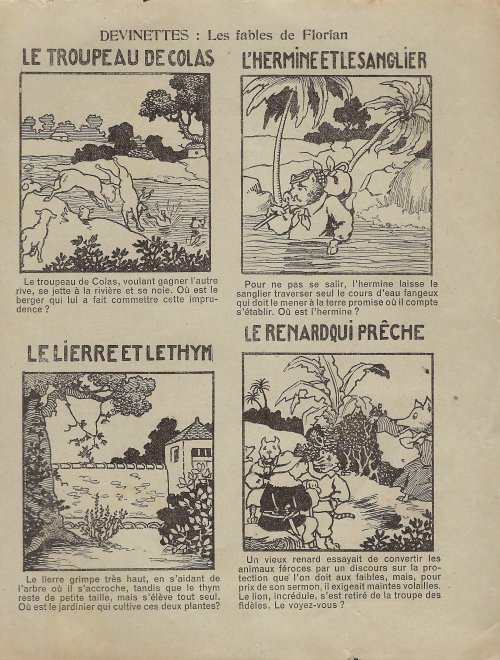 1930? Six pages of Florian “devinettes,” sets of four hidden picture fable illustrations. $6 each from Bertrand Cocq, Calonne-Ricouart, France, Sept., ’20.