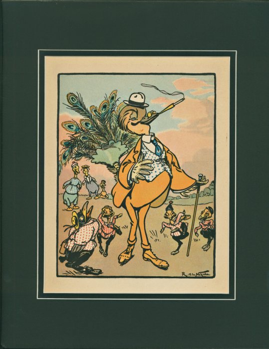 Typically delightful Nézière work! This bird is a plump fat cat with a large belly and all the accoutrements: walkng stick, gloves, pnce-nez, cigarette holder, and hat. He cuts a figure. Unfortunately for him, that is all that he does!