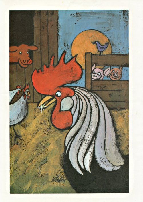 The eye is drawn in this lively picture to the jewel in the rooster’s craw. Most of the creatures here seem surprisingly happy, particularly the cow and the pigs. Are they too anticipating food?