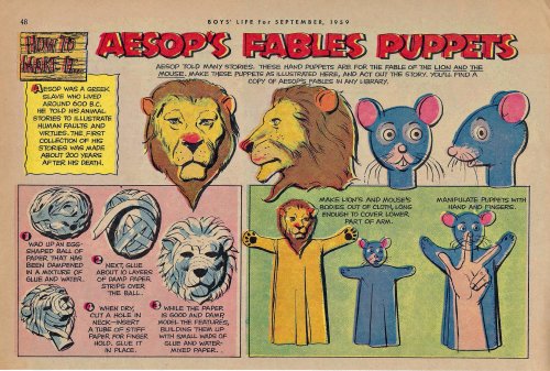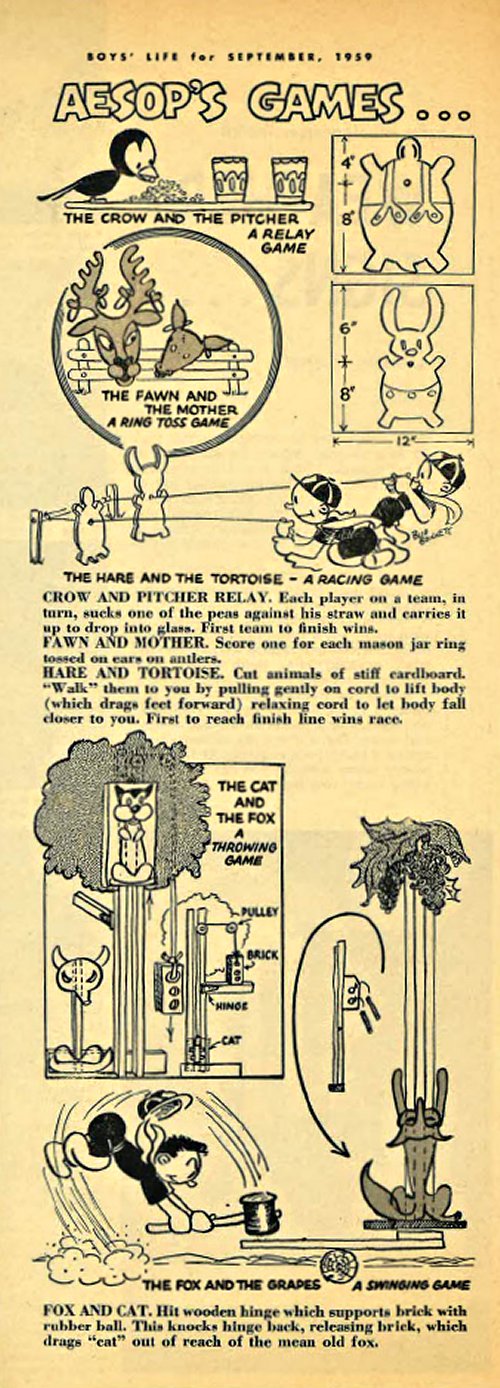 1959 “Aesop’s Games” and “Aesop’s Fables Puppets.” Features in Boys’ Life, Sept., ‘1959. From Carrie Carter, Alliance, OH, Oct., ’13.