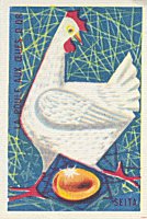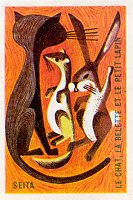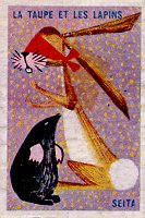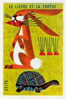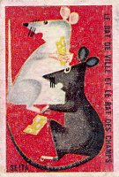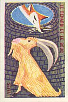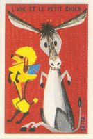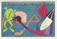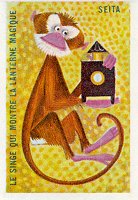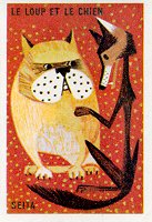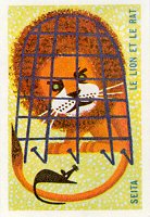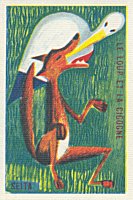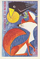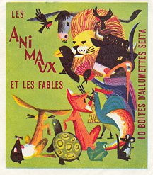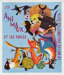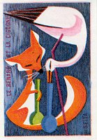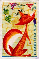 These are lovely designs, much different in their simplicity from the simple Russian matchbox covers. As one can see from actual French matchboxes, a picture design was used on only one of the two large sides, by contrast with the double images for Russian matchboxes. Do not miss the excellent use of color in SS and of form in "La Jeune Poule et le Renard" and FG. There are excellent facial expressions on the animals in "Le Rat et l'Huitre," LM, WL, and "Le Singe qui Montre la Lanterne Magique." It is a special pleasure to find such loveliness in simple things!