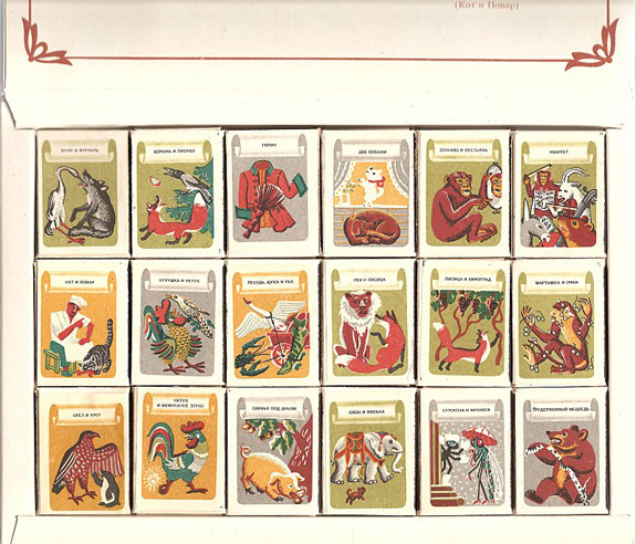 1992? Eighteen matchboxes, each giving the title and an illustration for a fable of Ivan Krylov. $25 from Samuel Princell, Lille, France, through eBay, Dec., '05.