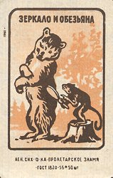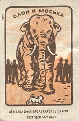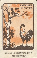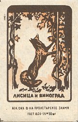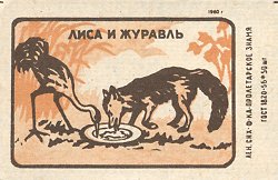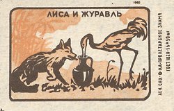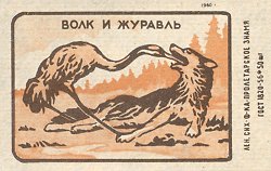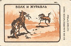 1960 Eight single matchbox labels, each giving the title and an illustration for a fable of Ivan Krylov. About 2" x 1¼". Each cover has a tiny "1960" inscribed outside the border of the scene itself. $2.99 from Alexander Basoc, Highland Park, IL, through Ebay, May, '00. Extra set for €20 from Albert van den Bosch, Antwerp. June, '23.