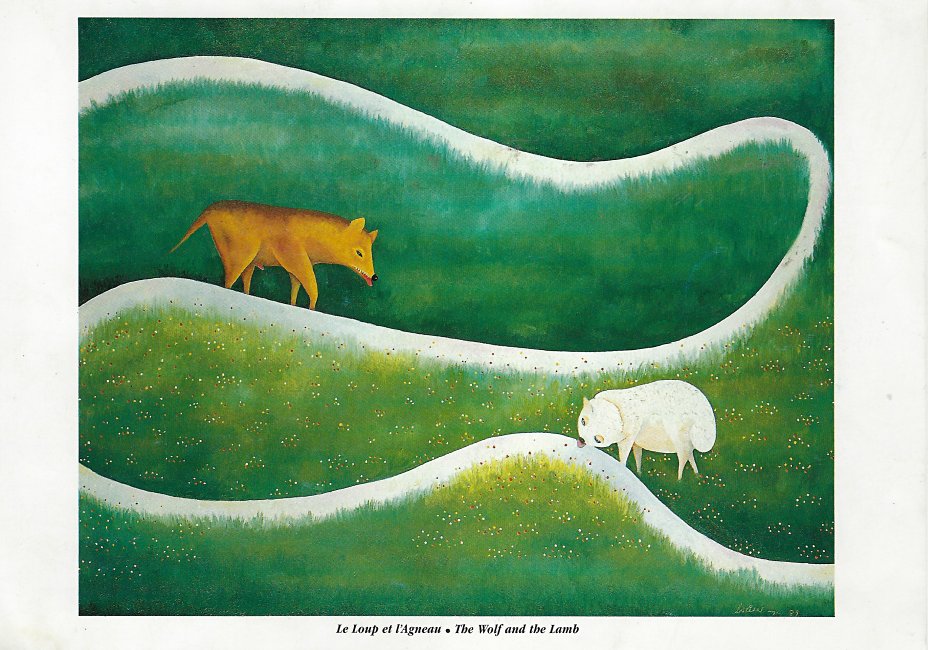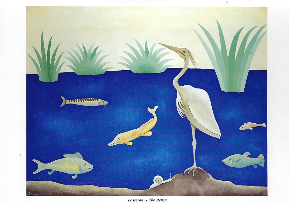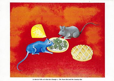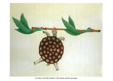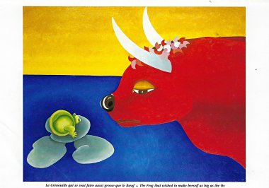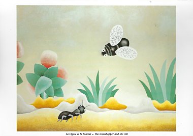1990? Set of eight menu jackets edited by Service Publicité d'Air France and used by Air France on dinner flights. Art by Willy Aractingi. Texts of La Fontaine as translated by Walter Thornbury. Gift of Nicole Dodier of Air France Publicité in answer to my request, Jan., '92. Extra copy first sent me by Terry Maguire from a Boston-Paris flight. Extras of MM, TMCM, and "The Pig, the Goat, and the Sheep" from teal1 through eBay, August, '02. Two more -- WL and LM -- found for €6 in Paris, June, '19. Three further menu jackets from Outremont, Canada. "The Heron" for $9.95 from Michael Burlew, Forked River, NJ, through Ebay, Dec., '07. Extra copies of TT; LM; GA; and OF from Christine Bauman, Greenwood, IN, through Ebay, August, '18. TT for €10 from alexis13_123 through Ebay, Sept., '23.