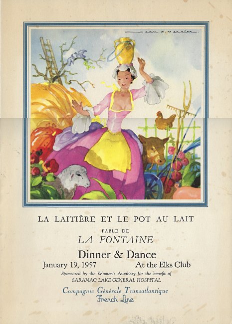1956 41 different menus illustrating eight different fables with La Fontaine's text printed for the Compagnie Générale Transatlantique French Line. For use on transatlantic voyages between December, 1956 and July 11, 1959 on ships "Liberté," "Flandre," and "Ile de France" and at a dinner and dance at the Elks Club January 19, 1957 sponsored by the Women's Auxiliary for the benefit of Saranac Lake General Hospital (in the Adirondacks in New York State). Images by Jean A. Mercier. The menus cost between $3.66 and $30 each. While I did not keep track carefully of where I found all 41, aligning the dates of the menus showed distinct groupings and helped me match some menus with sellers. Those curious can find the list of fables, dates, ships, and sellers here.