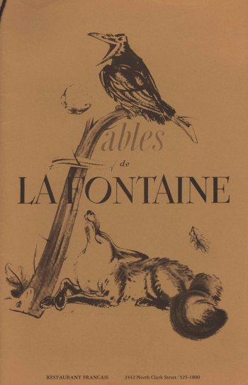1950? Menu: Restaurant Francais. 2442 North Clark Street, Chicago. "Fables de La Fontaine." 9" x 14". $4.99 through Ebay, May, '19.