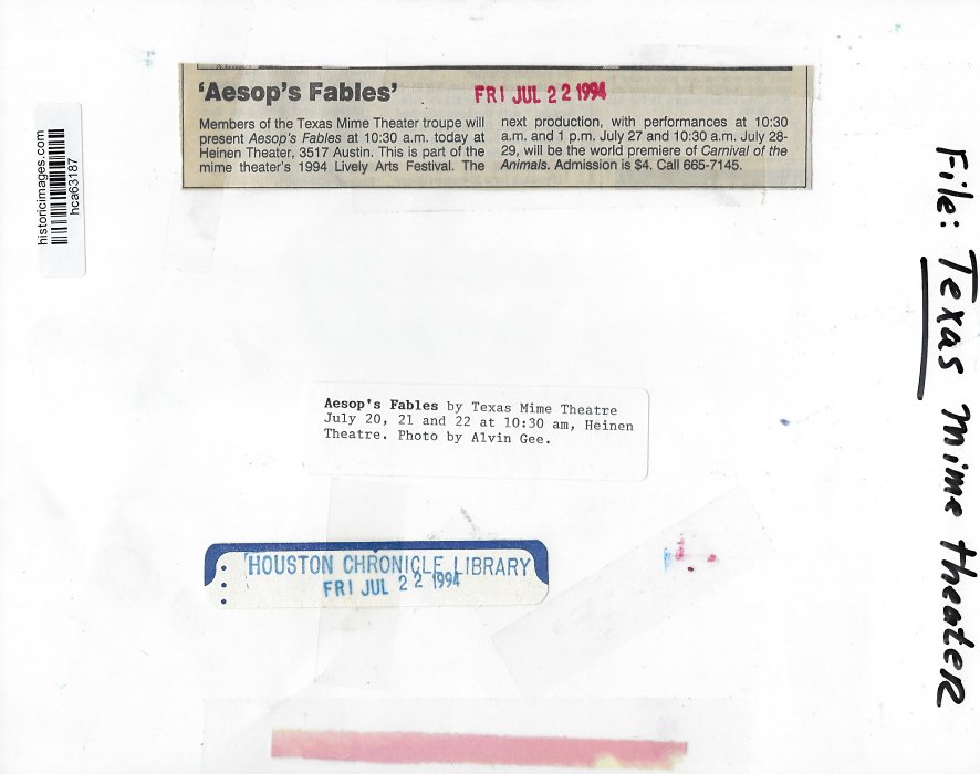 1994 Press Photo of Texas Mime Theatre Members in Production of "Aesop's Fables," July 22, 194, at Heinen Theater. Houston Chronicle, July 22, 1994. Photo by Alvin Gee. $10 from Historic Images, Nov., '16.
