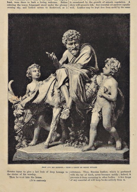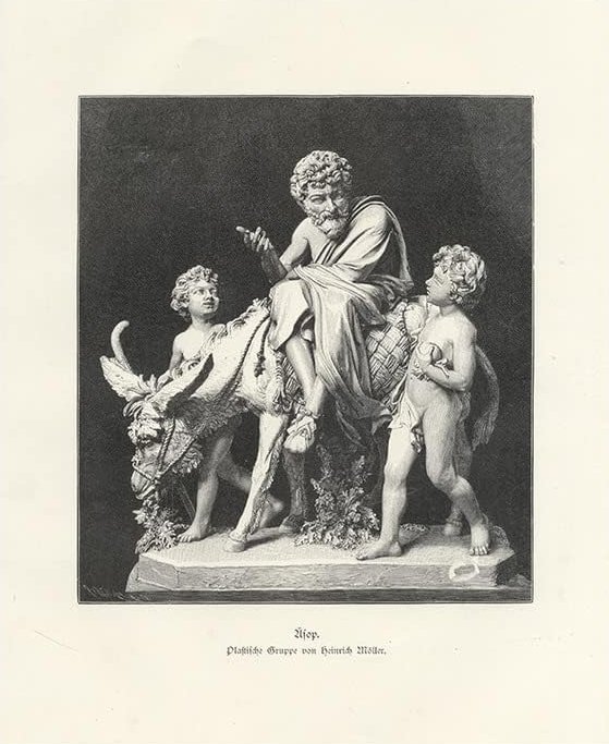 1910? Magazine excerpt featuring a line engraving of Heinrich Möller’s sculpture group of Aesop with two children. Unknown source.