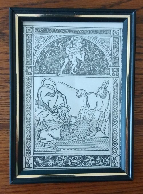 This is an object where fable-collecting connects with other big things in my life. One of those things that I have done less well than others is to serve as a superior in several Jesuit communities. The object here is a framed Xerox copy of Francesco del Tuppo's 1485 image of the animals attacking the sick old lion. They are, one after another, paying him back for his heavy-handed rule over them. They can do so now that he is weak and in his last days. The lion understands it from others but is particularly insulted by being humiliated by the donkey. My good friend Fr. Mike Zeps, S.J., was charged with giving a farewell speech as I finished a difficult stint as a Jesuit superior -- difficult for me, and probably even more difficult for many of the Jesuits there. To offer a gift fit for its recipient, Mike actually went to the public library and found Taplinger's "The Life and Fables of Aesop" with del Tuppo's illustrations and chose this image of "saying good-bye." Mike knew my taste well enough that I would enjoy the wit of the selection. Notice that the donkey is not only kicking the lion in the mouth. He is also expressing himself with another bodily reaction. Fable can bring wit and even a kind of consolation to a tough moment!