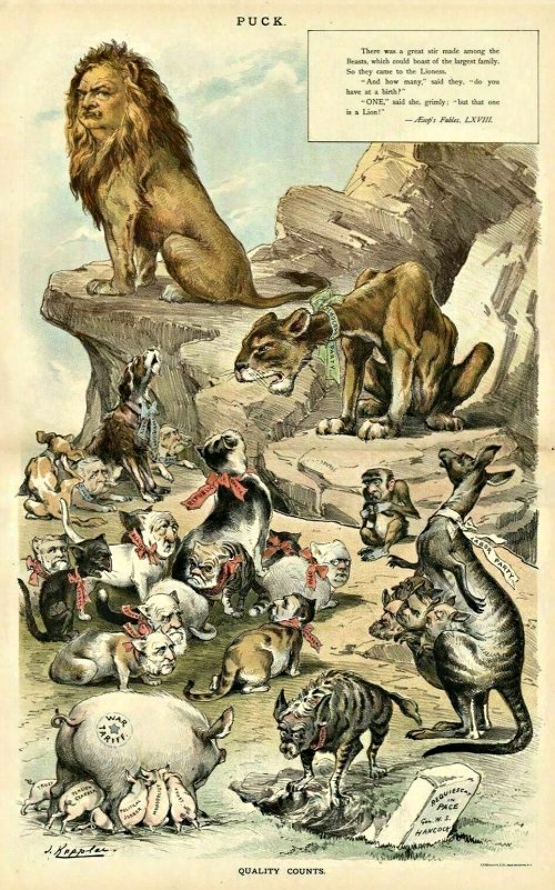 This is the largest and most complex yet of our growing collection of political cartoons. The fable presented here is “One, but he is a lion.” Various parties are represented as animals: Democrat lion, Prohibition dog, Republican cat, and Labor kangaroo. Tariffs are a sow suckling a number of piglets.