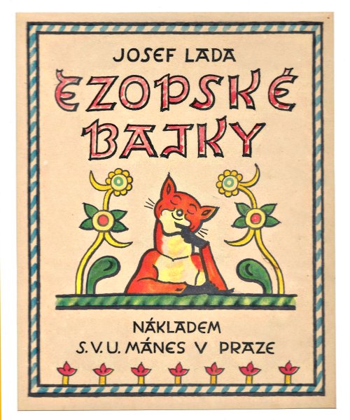 1931 Josef Lada: Ezopské Bajky. Prague: SVU Manes. Total width and length: 1'x17". Image size: 7.4"x9;.25". CZK 1,500 from Antikvariát Valentinská, Prague, Nov., ‘25.