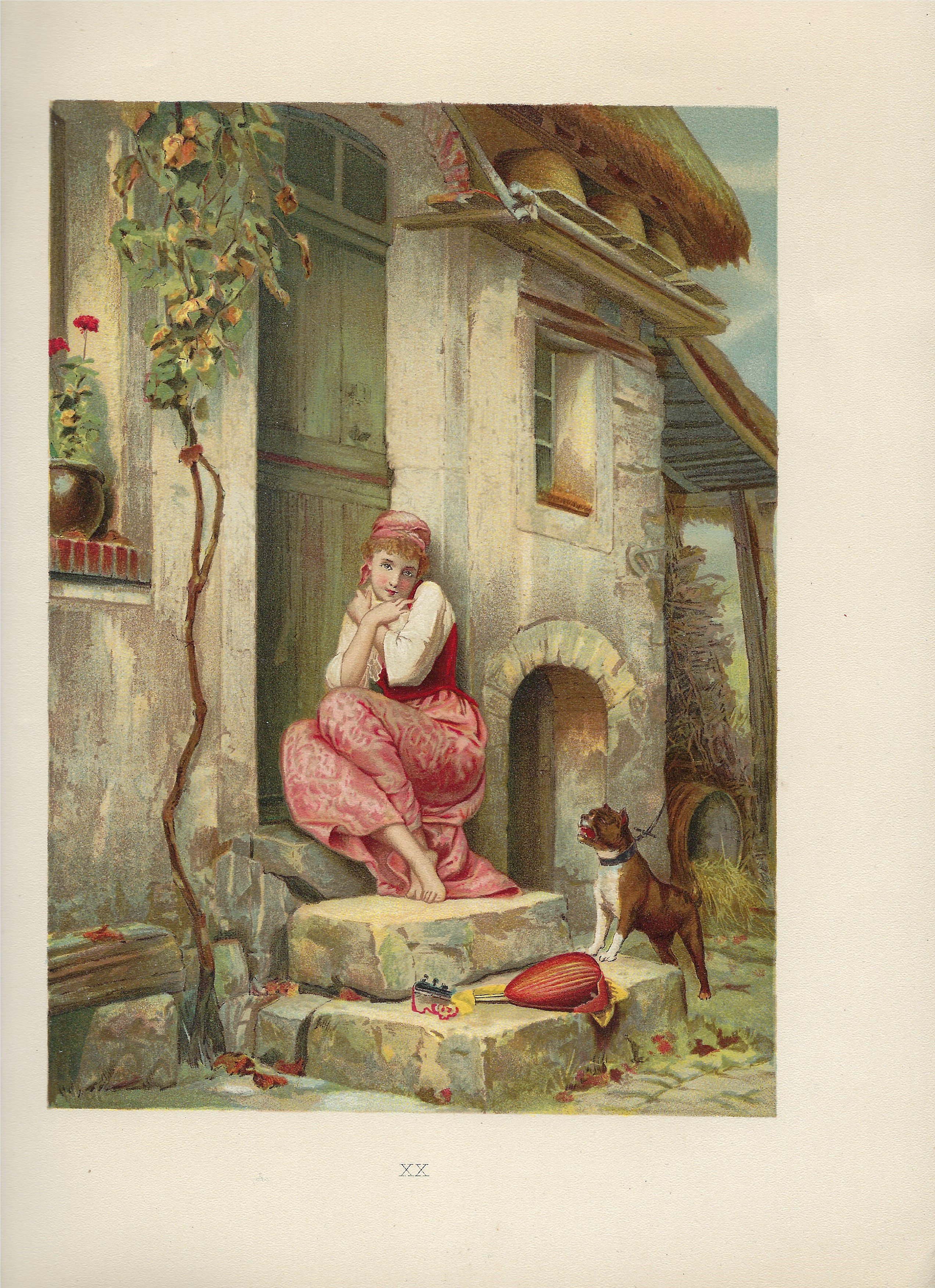 The owner’s name is given as L. Hawk and the work was copyrighted by Gravure Goupil & Co. Hawk’s collection is given as in New York. The print’s date is unknown, but the original painting was completed in 1869 and was signed by the artist himself in the bottom right corner. Painted in the image are two women, a dog, and several doves. An American collector and an American publisher have picked up the French tradition of sympathy with the mendicant artist, here harassed by the dog as well as the ant-like housewife. The dog and the doves find shelter here, but the artist finds nothing but rejection. I have found a second Metzmacher "Cigale." See below.