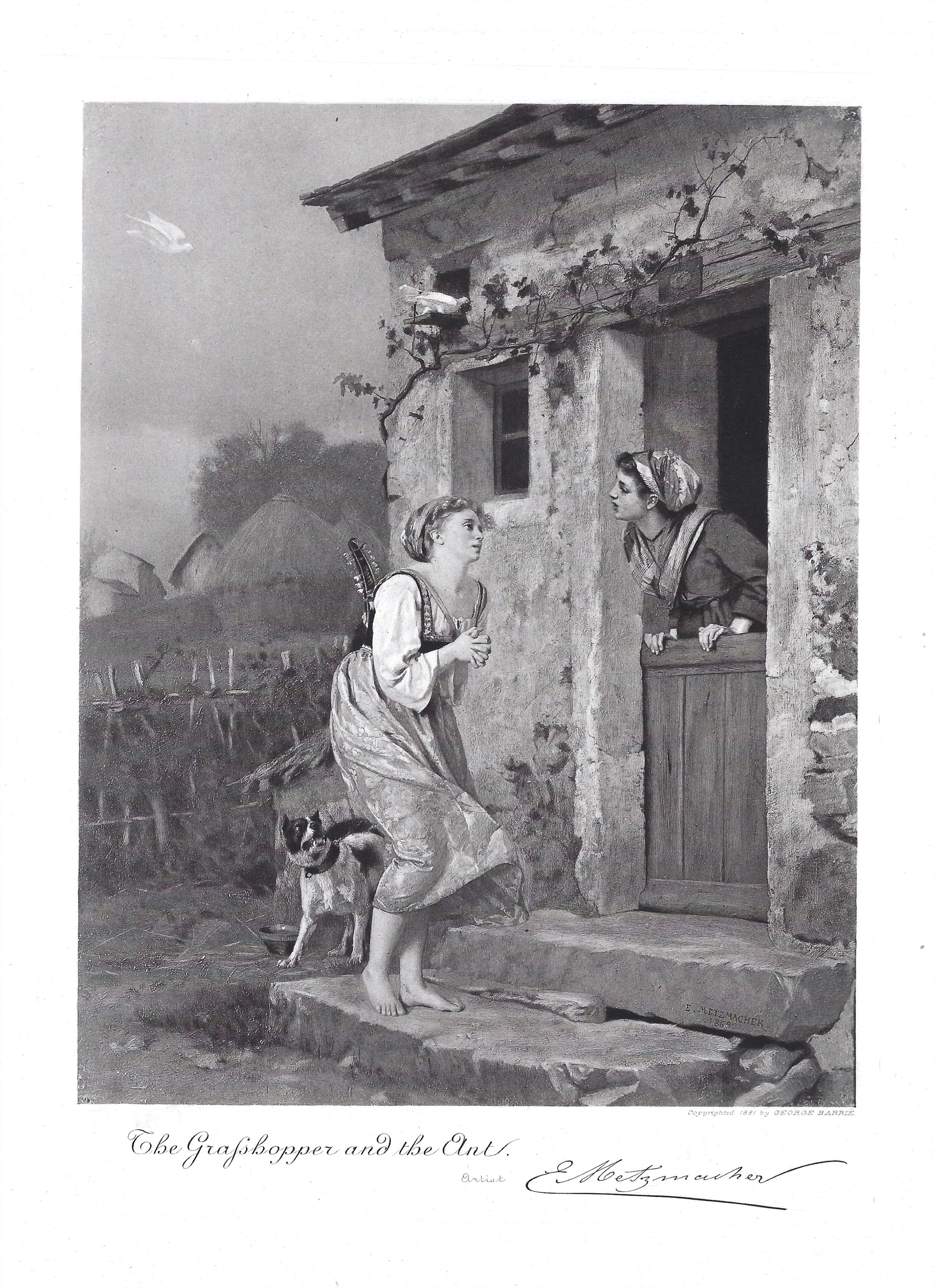 1881 "The Grasshopper and the Ant." Print of an original painting titled “The Grasshopper and the Ant” by E(mile Pierre) Metzmacher. Copyright 1881 by George Barrie. 9” x 12”. From martin2001@martin2001. Unknown cost and date.