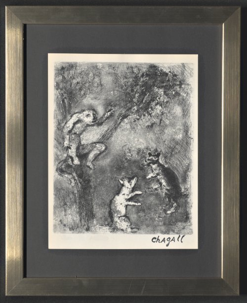 1957 Print Facsimile of Marc Chagall's Etching "Wolf and Fox Before Monkey Judge." Printed in West Germany in 1957 based on Chagall's 1952 etching. Mounted in acid free black board. Overall size 12" x 15". $149 from TxArtGallery through Ebay.