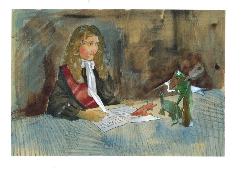 La Fontaine, dapper as ever, looks at rabbit, grasshopper, stork, and tortoise, while a fox or dog emerges from the printed page as though out of the earth or a hidden well. Do I read this image wrongly, or are those characters a bit unhappy with the writer?