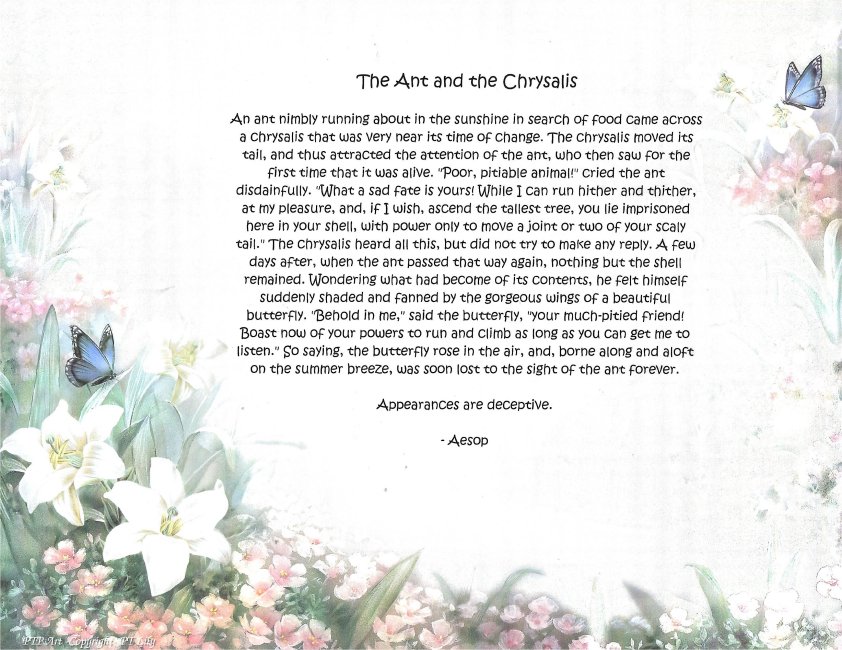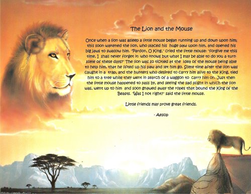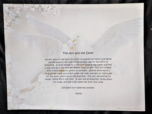 These are a mystery to me in summer of 2025. They are nicely printed on heavy stock. LM and DS are particularly colorful. Nowhere on the web can I find these pictures used with Aesop’s fables, and all five that we have are characterized as from Aesop. Two image backgrounds, DS and “Ant and Chrysalis,” are featured now by Personal Touch Products, but with different texts. Several are offered in different forms on Etsy. Might someone have used PTP backgrounds, some of which have been discontinued, and added fables to them?