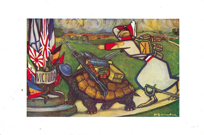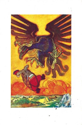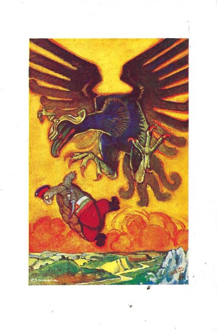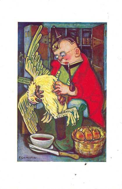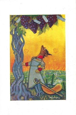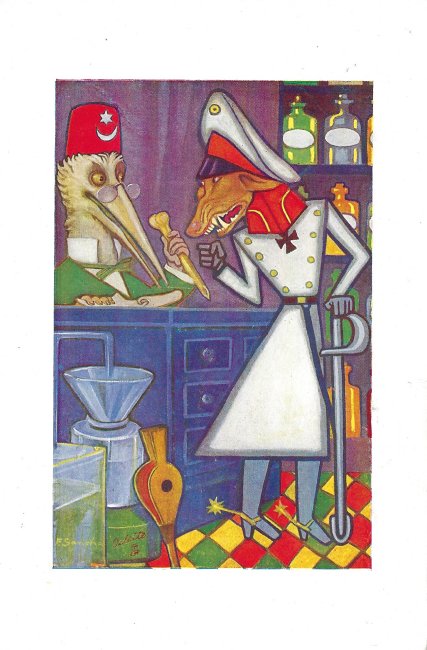 I was surprised to find these six images in other than postcard form. As I describe a propos of the postcards, fables are used in this instance to satirize Germany. The fable texts on the message side there appear in Dutch, Spanish, Italian, Portuguese, or English on individual cards; words printed on the image side shift correspondingly. There are no indications of a source for these, except perhaps that they appear to be in Spanish. My, things get around!