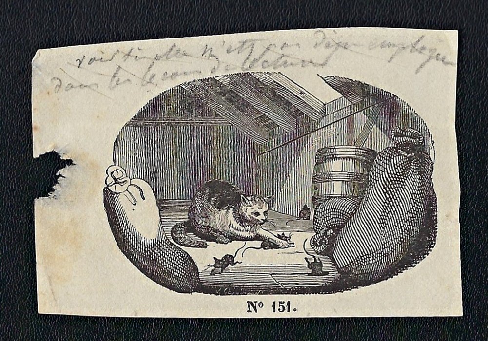 Image 3" x 2". Indecipherable script above the illustration. A copy was apparently used in a Russian translation of Perrault's "Puss in Boots" in 1868. It must have been out there for people to copy.