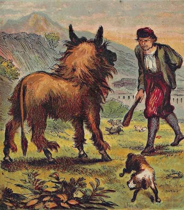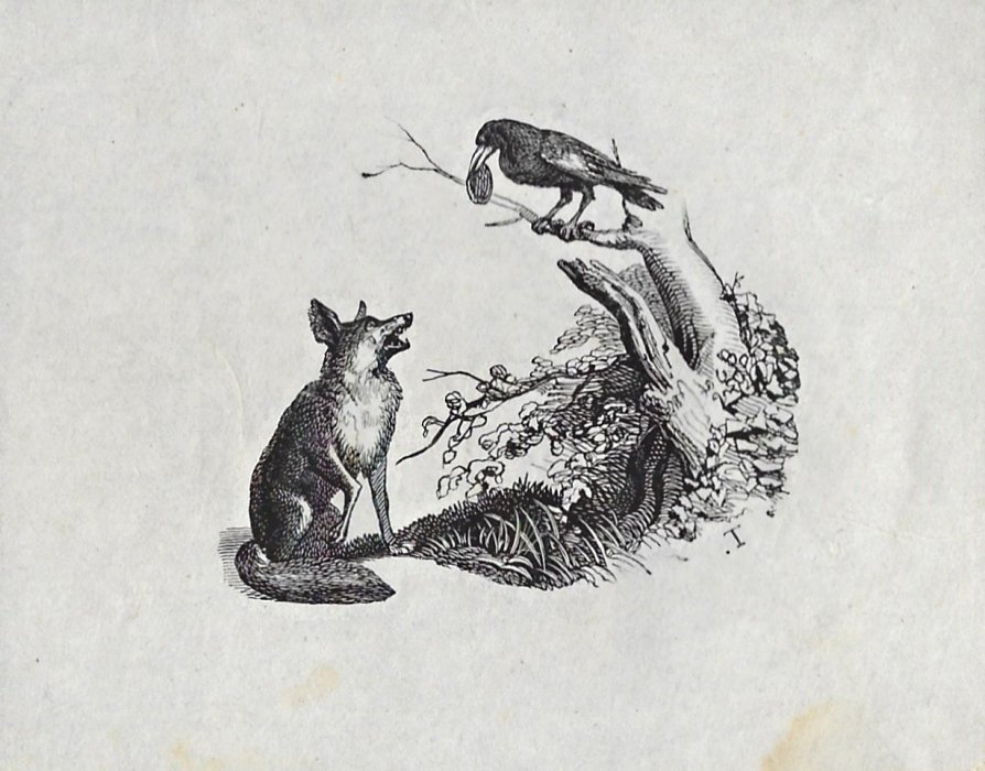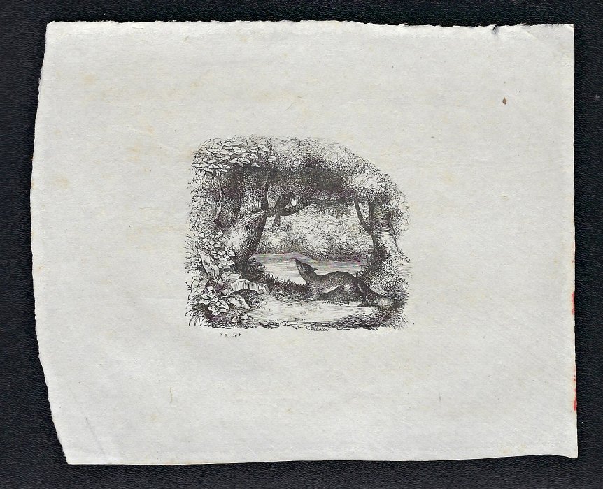 Paper. 4" x 3.3." The fable is so often repeated that I did not expect to find an exact equivalent for this illustration. Online searches in fact did not find this image. Might there be a "T" at the base of the tree?