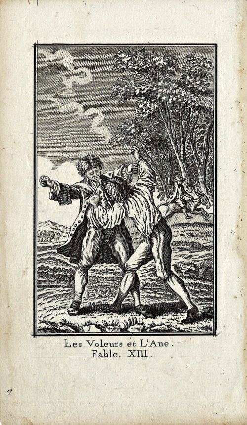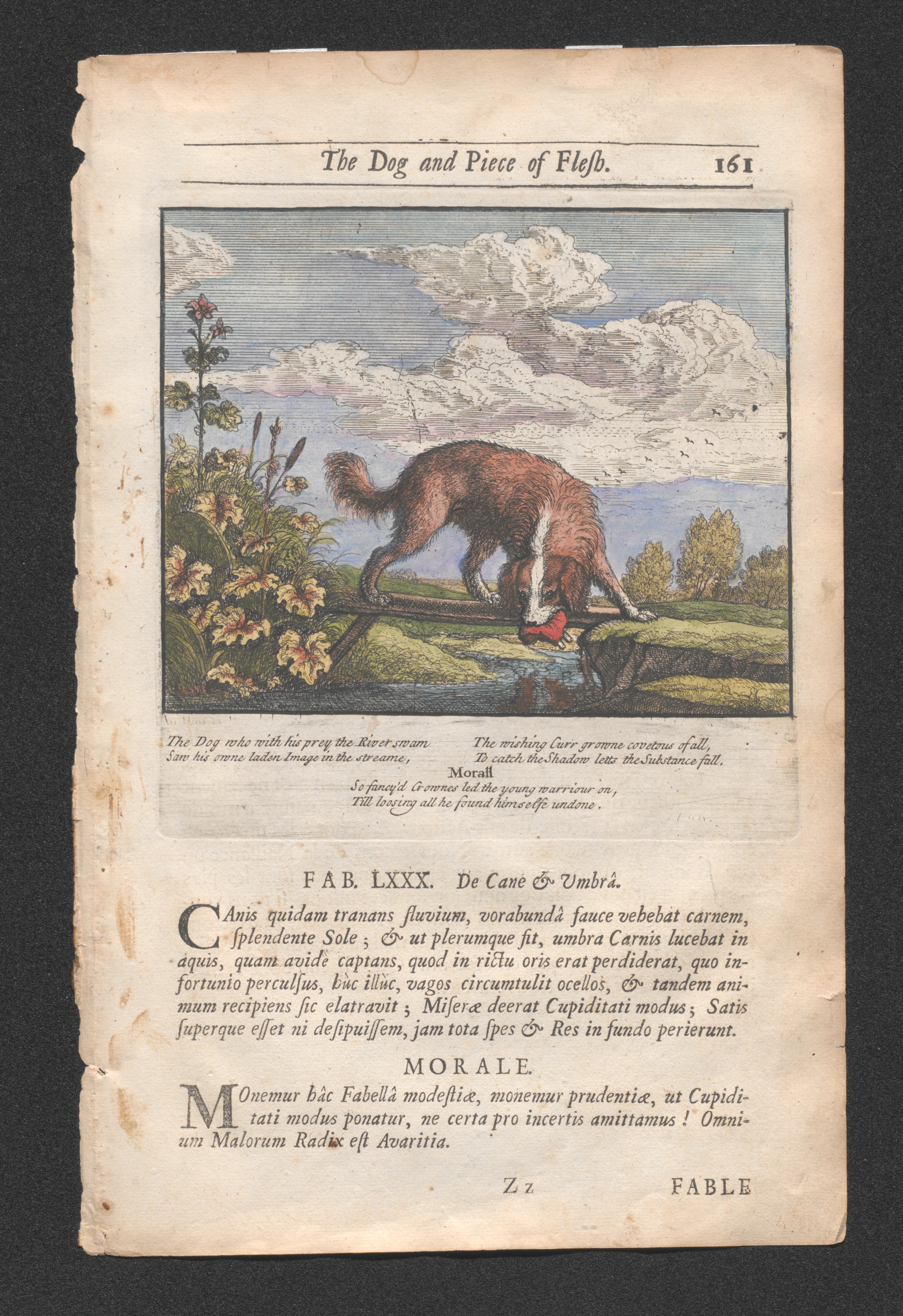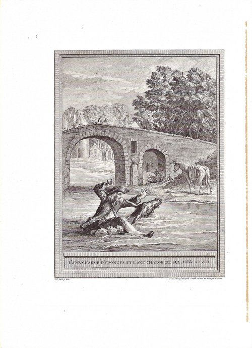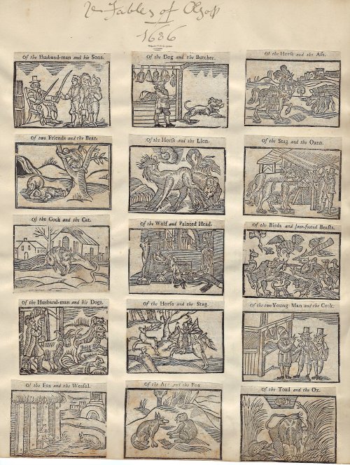 Our collection includes a set of 188 woodcuts from an English language Aesop of 1686; a large set of separated pages from Francis Barlow's 1687 second edition; 33 pages from the 1768 edition of Etienne Fessard;;and a variety of individual separated pages. Click on image or title to see the page.