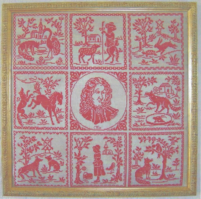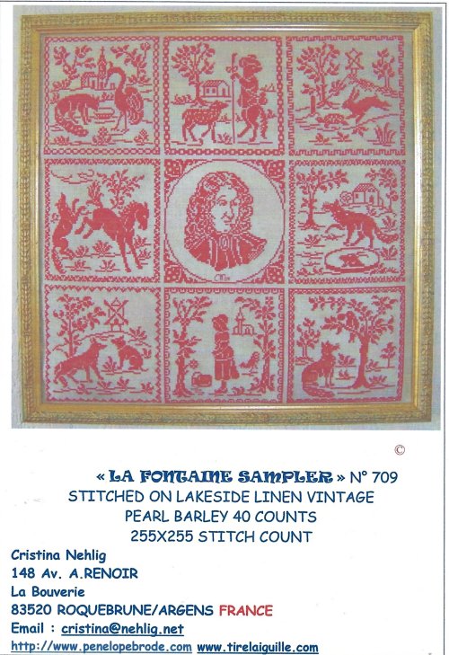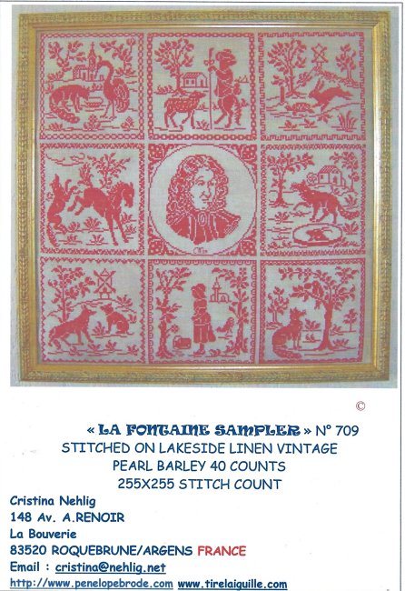 2010? "La Fontaine Sampler." No. 709. Image of finished sampler and 4 pages of A4 patterns. Cristina Nehlig, Roquebrune/Aergens, France. Unknown source.