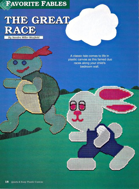 1990? "The Great Race." Pages 19-22 of "Quick & Easy Plastic Canvas" magazine. Also available from the magazine as a stand-alone plastic canvas. Source unknown.