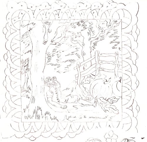 A two-page spread of this large () publication offers patterns for embroidery, including one for a tea “serviette,” which generally means “napkin.” A philosophically inclined napper under a tree wonders why a big tree does not produce bigger fruit, like a pumpkin. An acorn falls on his nose and he has an answer! However deep the coloring of the lines was originally, it is now quite light.