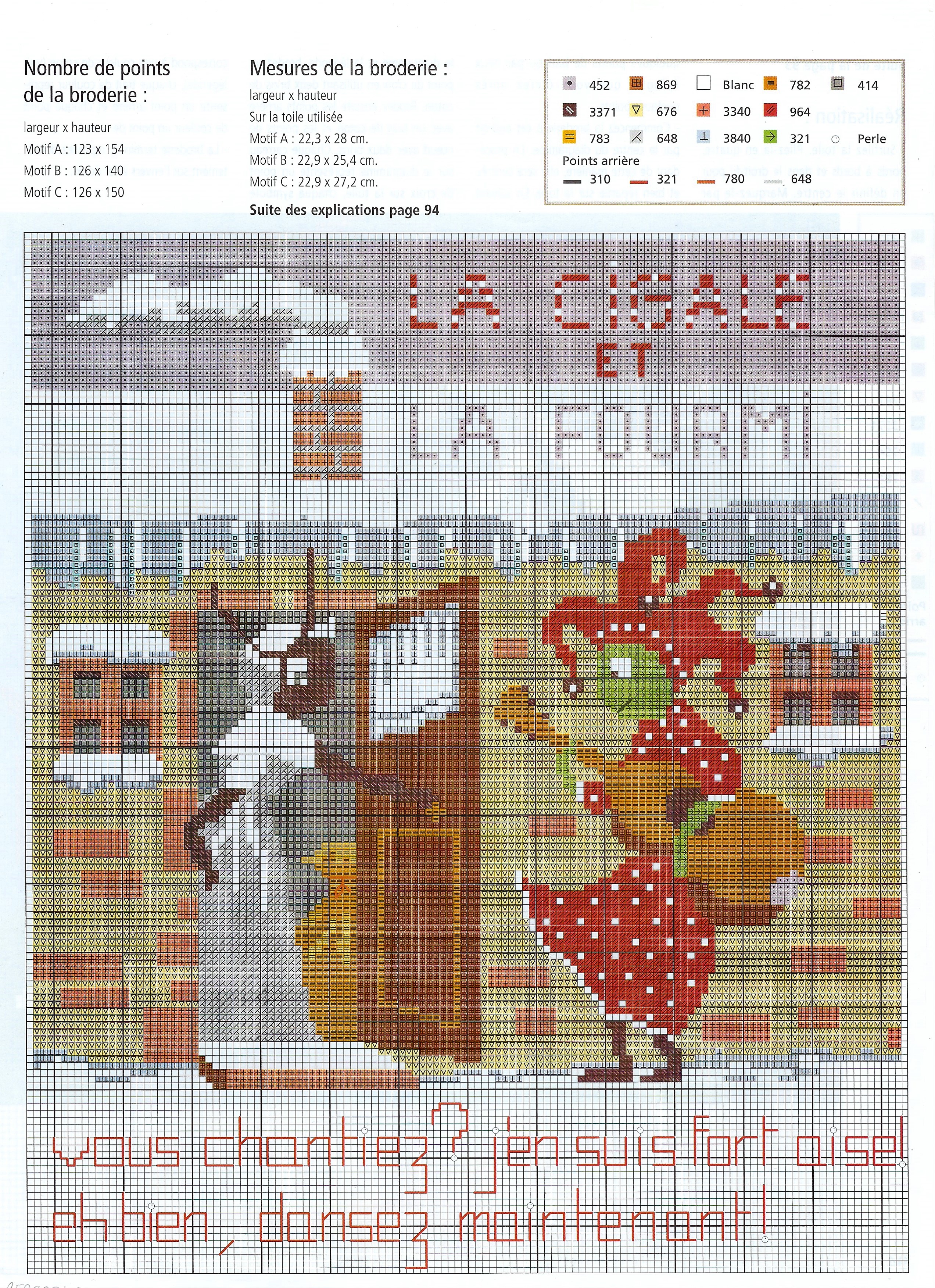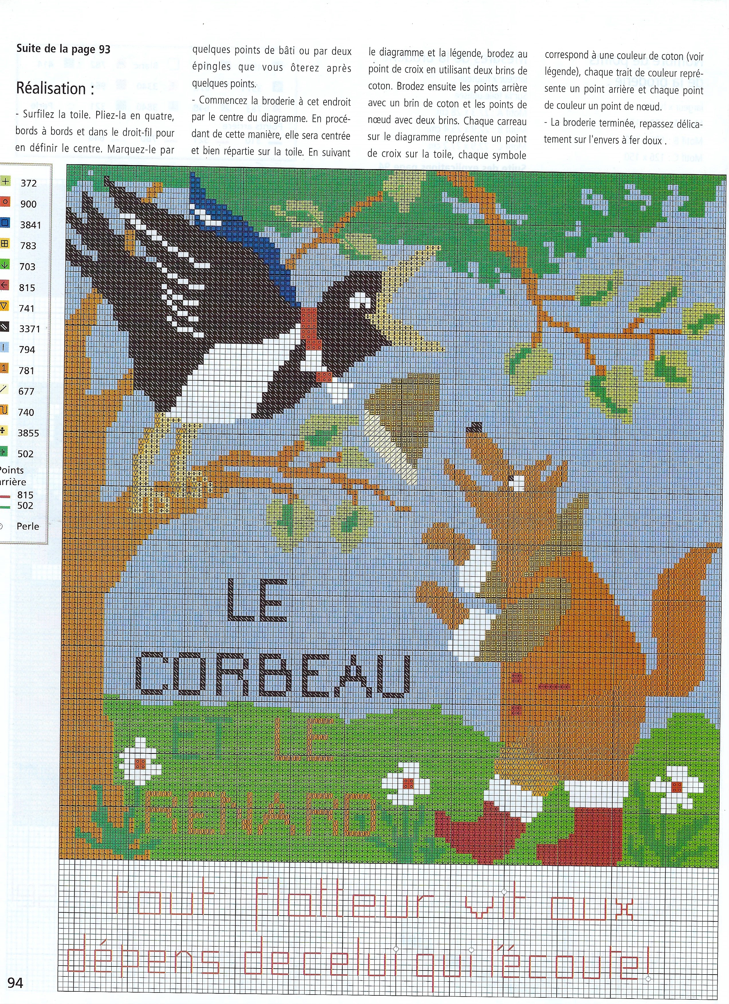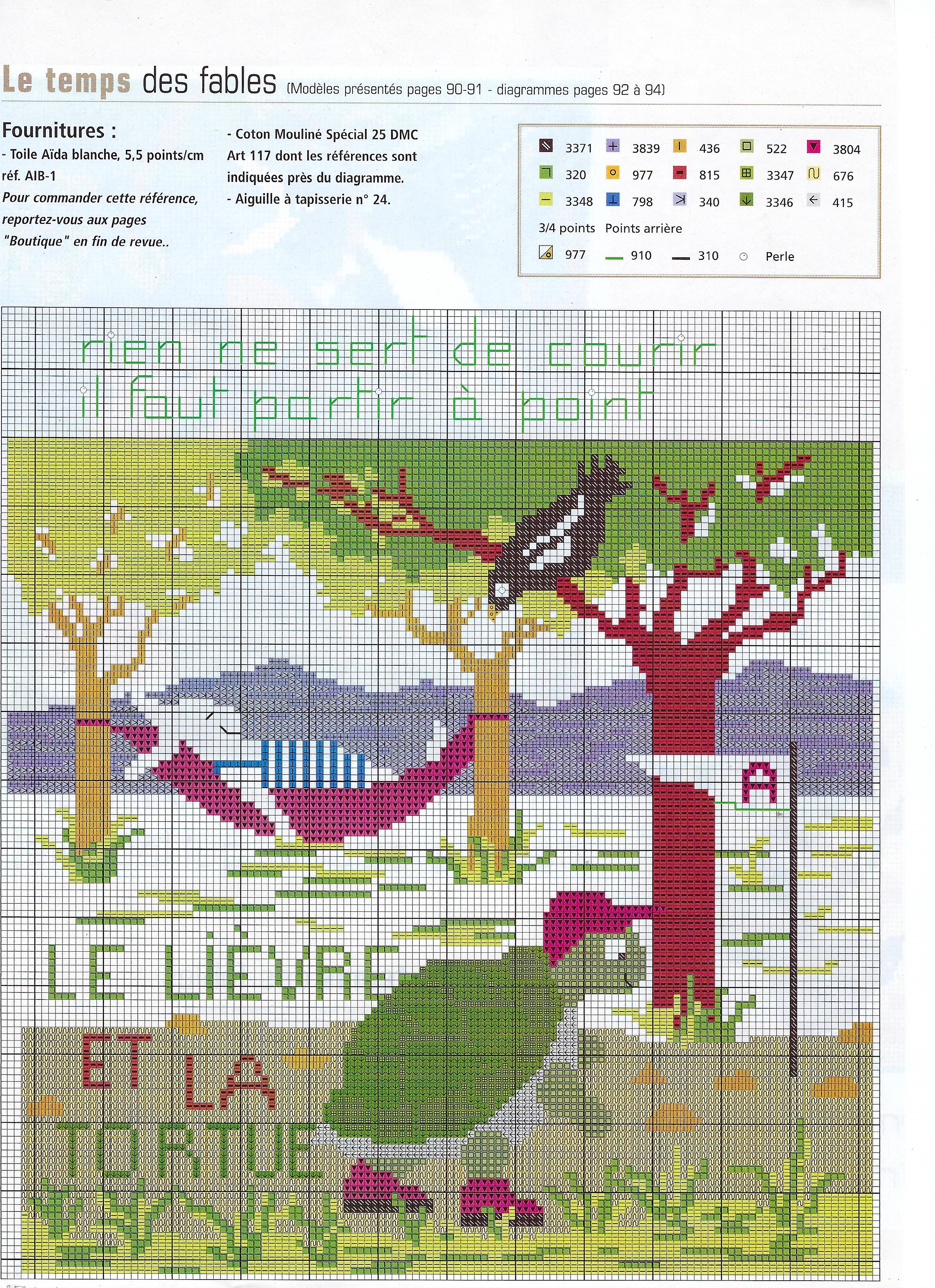 2000? “Le temps des fables,” Ouvrages Broderie.” Muriel Revenu. Three cross-stitch patterns of TH, GA, and FC. 8.4” x 11.75”. Unknown source.