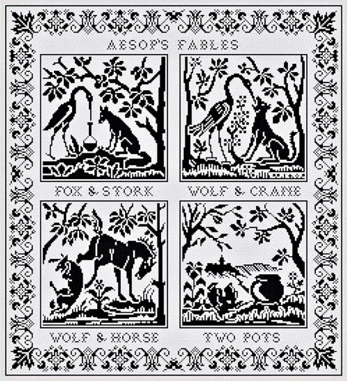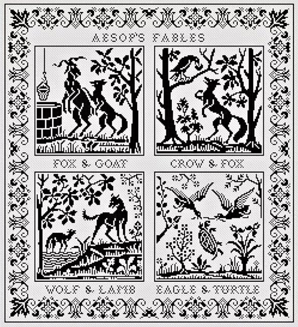 Aesop's Fables > Aesop's Artifacts >...> Series of Sewing Designs > Aesop's Fables Monochrome Cross Stitch Sampler
