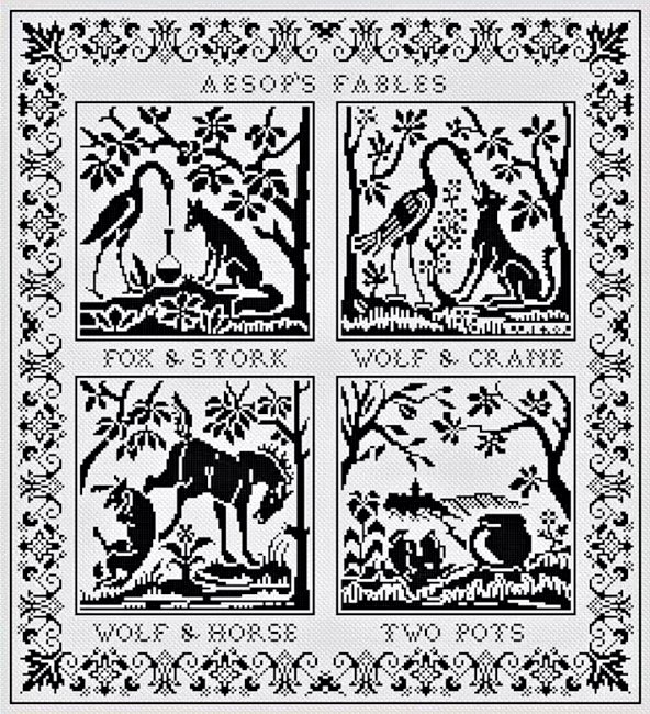 Aesop's Fables Monochrome Cross Stitch Sampler