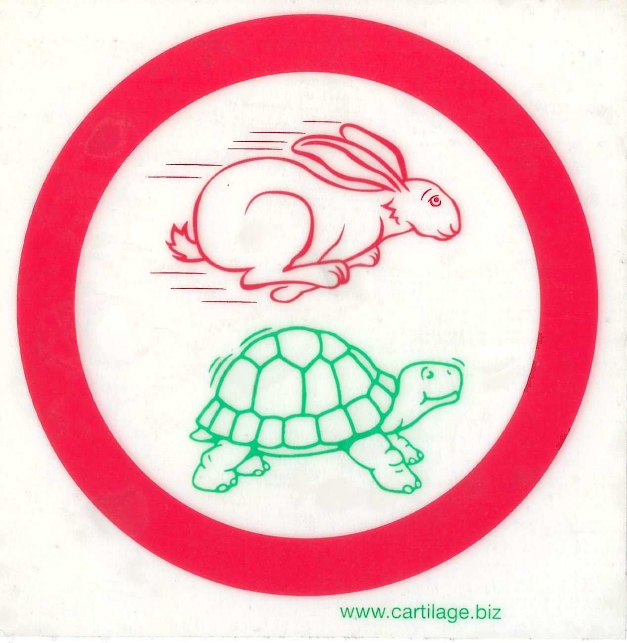 I wonder where and how we got these! Eight have www.cartilage.biz at the bottom, and 3 have www.hareandtortoise.co.uk. The latter seem to belong to a London restaurant. I removed the transparent cover of one to scan it. Stickers generally have the adhesive on the verso. And so I wonder how these were meant to be used. Red hare, green tortoise.