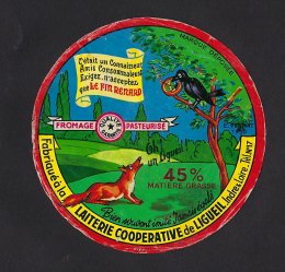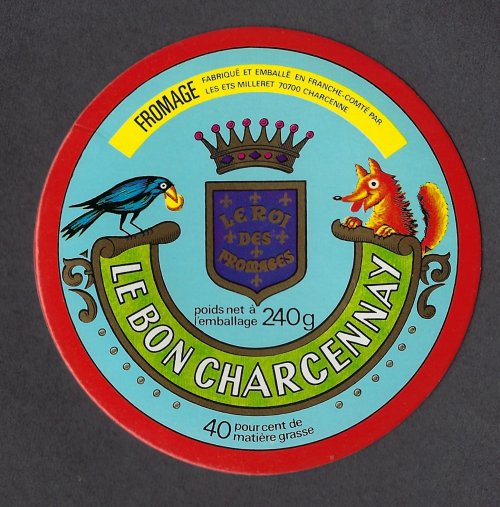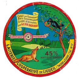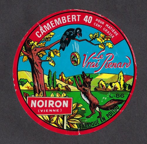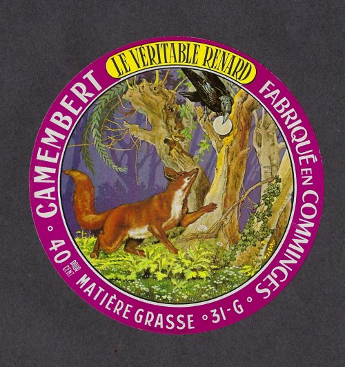 This circular label is a specimen of lovely colored printing. The crow, perched on the "Fromage" sign in the label, weeps visible tears. The fox walks away pleased, with a wheel of Camembert under his arm. There seems to be a number 41 stamped just above the crow's head.