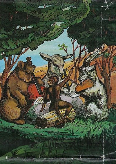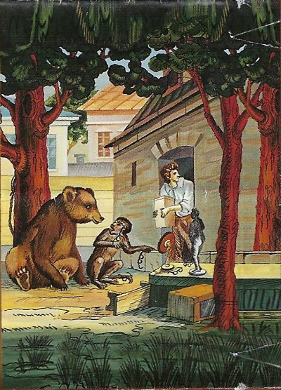 Bear and Monkey Detail: There are at least two fables here: The monkey does not know how to use spectacles. The monkey is also appalled at what he sees in the mirror. "I would die if I myself ever looked that bad!"