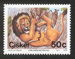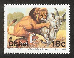 1989 Set of four full-color Ciskei stamps illustrating "Little Jackal and the Lion." Johan van Niekerk. $3.50 from Carolyn and Dan Lequerica at the CarDan Company, Fairfield, CA, through Ebay, Sept., '01.
