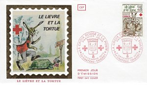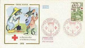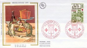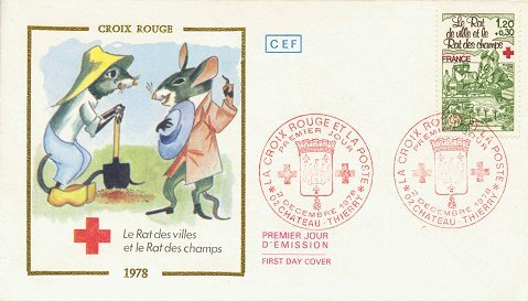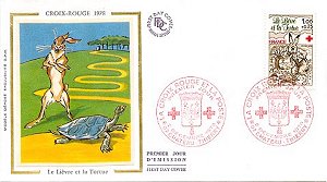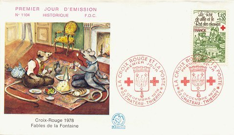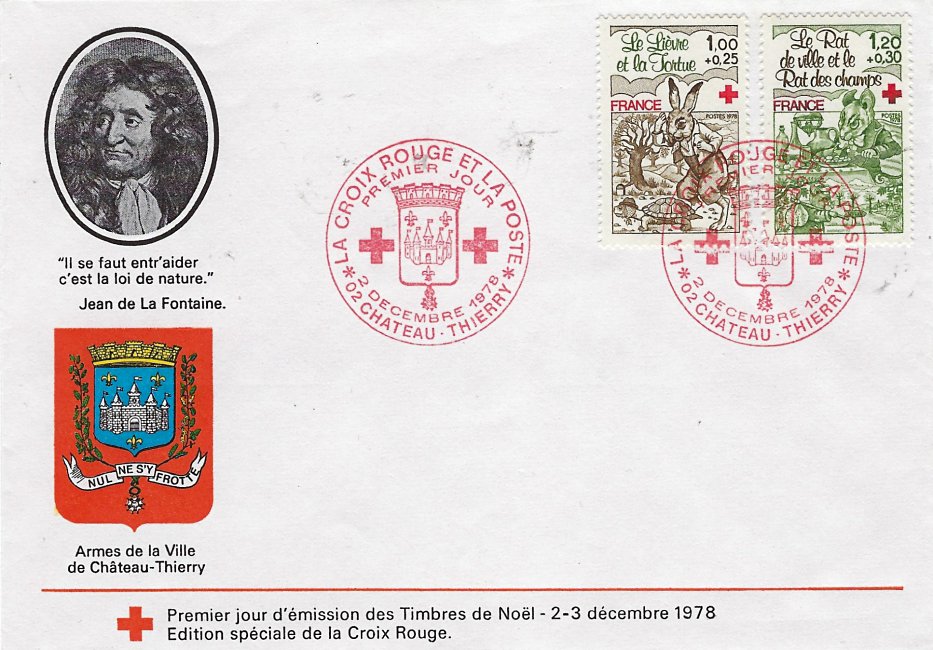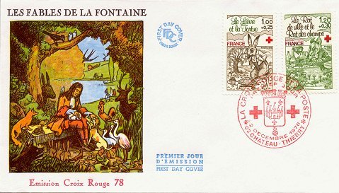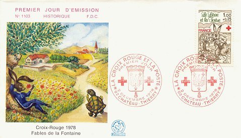 1978 Six French First Day Cover envelopes (and five extras) dated "2 Decembre 1978" celebrating and carrying stamps of TH and TMCM. The colored pictures on these envelopes show respectively La Fontaine in a pastoral setting with animals; TH at the start; TH along the way; town and city rats in the country; and two versions of the town and city rats at the city meal. La Fontaine: Between $2 and $5 from Karen Ross, Iron Mountain, MI, through Ebay, April, '99; Alexandre Prozopiorski, April, '99; Charles Legault, Gloucester, Ontario, through Ebay, Jan, '00; and Annick Tilly, Clignancourt, July, '01. TH envelope at the finish for $3 from Topical Paradise, Feb., 20. Envelope with La Fontaine portrait and Château-Thierry coat of arms for $1 from Topical Paradise, Jan., '20.