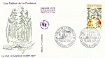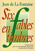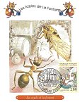 I found a three-holed landscape-formatted commemorative panel, almost 8½" x 12", containing the eight stamps, a colored hologram-like image of La Fontaine with animals by Odette Baillais, and a good section of text on La Fontaine. | ||