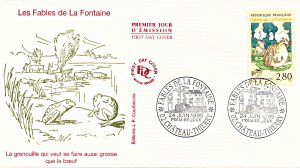1995 6 envelopes, each featuring on its left a line-drawing dramatizing one of the series of La Fontaine fable stamps issued on June 24, 1995. The envelope bears that same stamp in the upper right. All are postmarked, as is appropriate for an FDC, on June 24, 1995 from Chateau-Thierry . Éditions J.F. Courbevoie. $15 from Philippe Soriano, Paris , through eBay, August, '05.