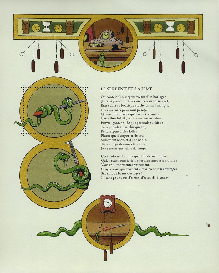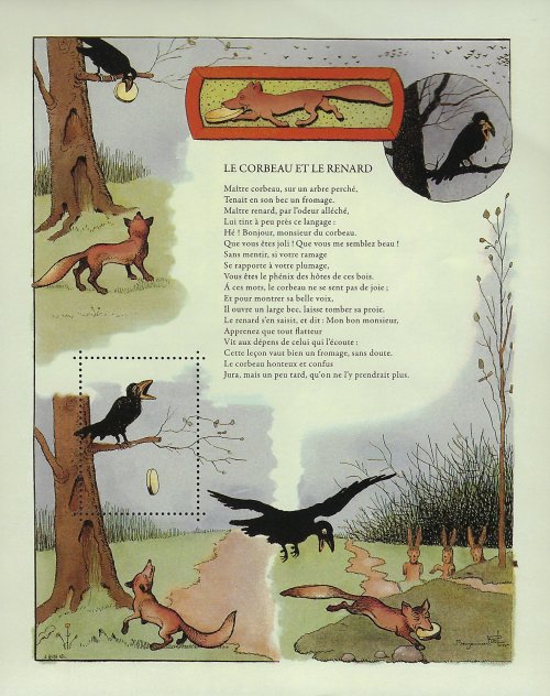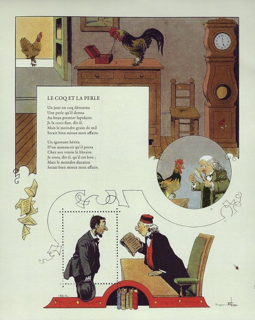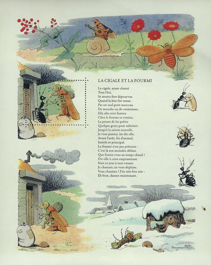 2010? Five postal souvenirs of the Fables of de La Fontaine, each with a perforated section to be removed from the surrounding image. GA; FG; CJ; “The Worker and His Children”; “The Snake and the File.” Benjamin Rabier. About 5.5" x 7". $5 each from Bertrand Cocq, Calonne-Ricouart, France, Sept., ’20.