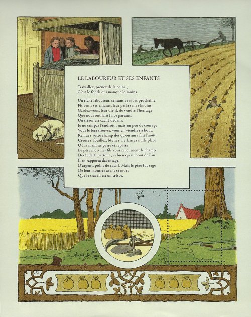 I believe I have never seen something like this. And I can find no exemplars on the web. The reprinting of Rabier’s pages is exquisite; it is of the sort one would expect from the makers of postage stamps. The choice of the portion perfectly circumscribed with perforation is fascinating, as when CJ focuses on the bumpkin ready to sell his valuable book. Similarly, “The Worker and His Children” focuses on a sickle ready to be wielded in bringing in the bumper crop. Some searching on the web revealed other such philatelic productions, particularly in France. The “stamps” generated here have apparently no value for the posting of a letter. Curious!