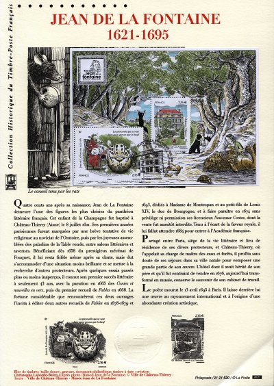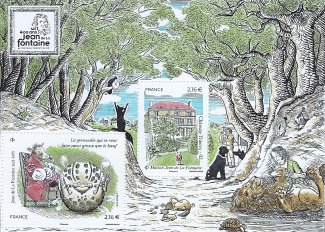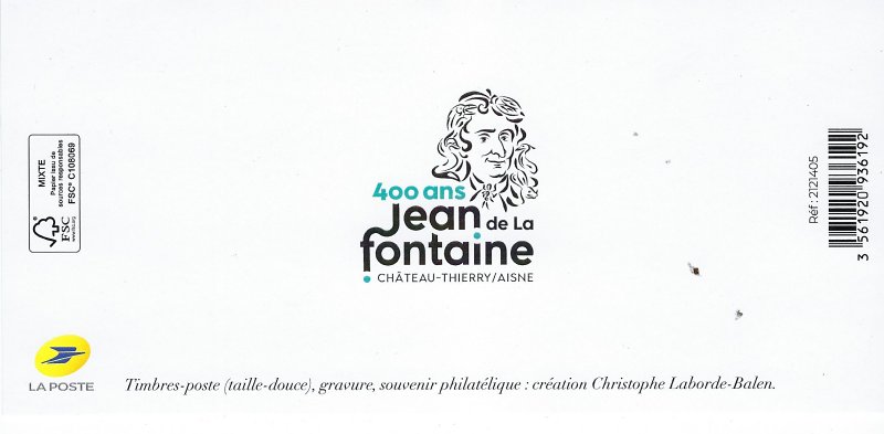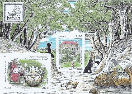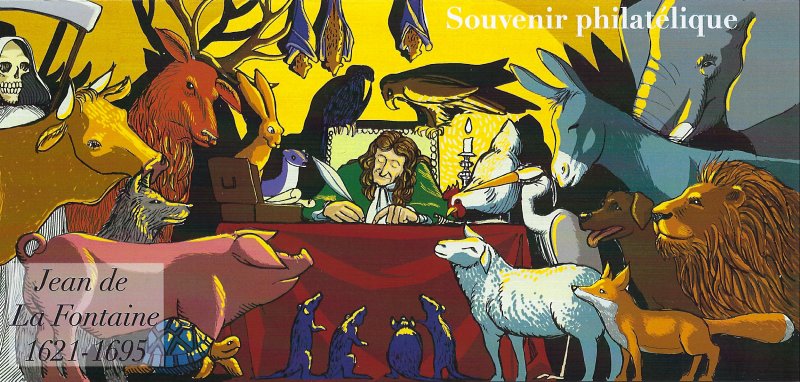 2021 Postal souvenir of the 400th anniversary of the birth of Jean de La Fontaine, consisting of a gummed scene including two stamps. Those stamps are perforated sections to be removed from the surrounding image. £8.99 from The Joy of Stamps through Ebay, Nov., '21.