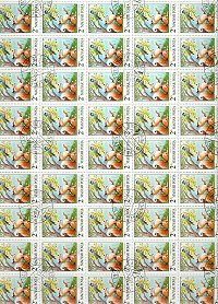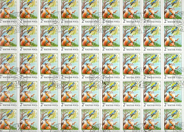1983 1 Sheet of stamps marked "Magyar Posta," "A Róka és a Holló," Füzesi ZS, and "2 Ft." FC. 10 stamps across by 5 down. 10" x 14". Scott #3103. Postmarked Budapest. $3.50 from John Ferrari, San Carlos, CA, through Ebay, May, '01.
