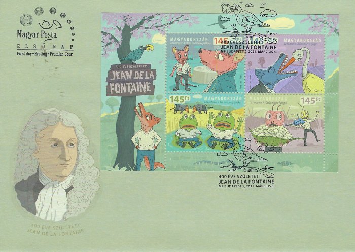 2021 FDC Envelope from the Hungarian Post Office featuring the four commemorative stamps and a cameo of La Fontaine. $13.77 from empirefondation1965 through Ebay, Dec., '21.