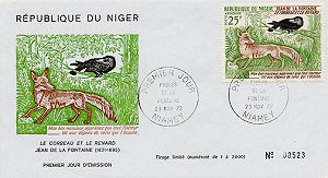 1972 On November 23, 1972, the Republic of Niger issued a set of air mail stamps in honor of Jean de la Fontaine, including the three specimens pictured below, each on a first day cover and each in a numbered series of 2000. $30 from Alexandre Przopiorski, August, '99.
