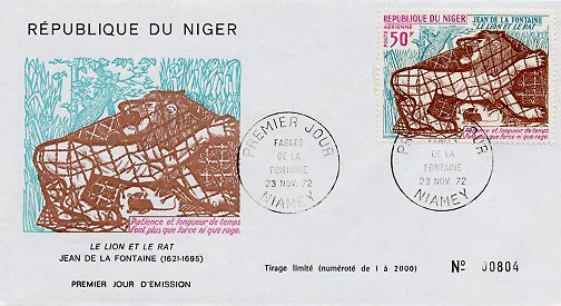 1972 On November 23, 1972, the Republic of Niger issued a set of air mail stamps in honor of Jean de la Fontaine, including the three specimens pictured below, each on a first day cover and each in a numbered series of 2000. $30 from Alexandre Przopiorski, August, '99.