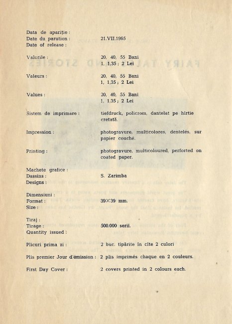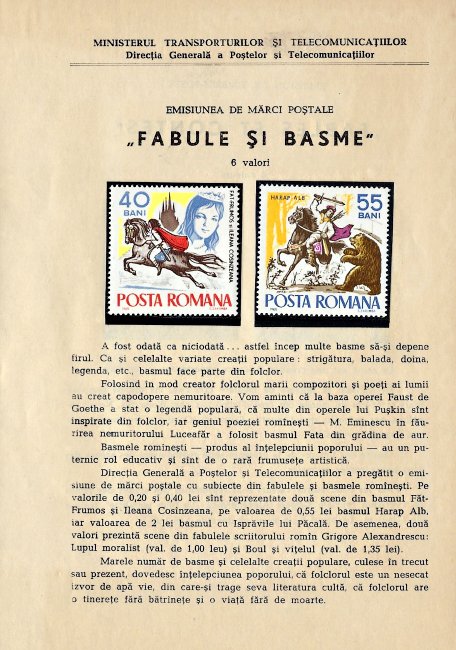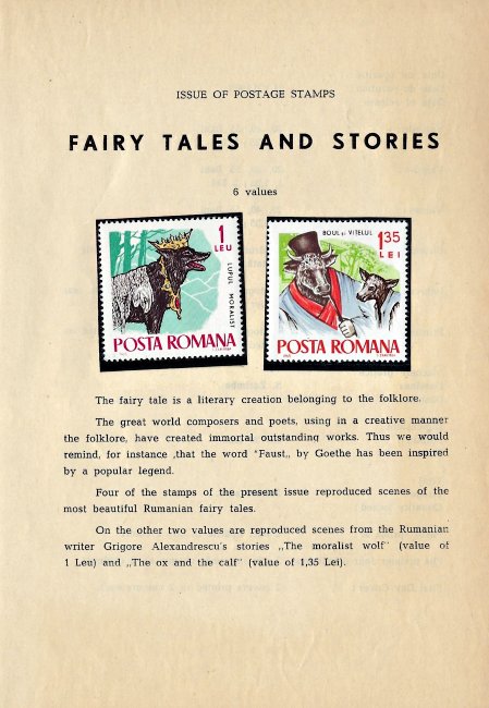 1965 Set of 6 Romanian postage stamps. “Fables and Fairy Tales.” Issued July 21, 1965. 20 Bani, 40, Bani, 55 Bani, 1 Leu, 1.35 Lei, and 2 Lei. Ministerul Transporturilor si Telecomunicatiilor. from Maria Marcu, Roman, NT, Romania.