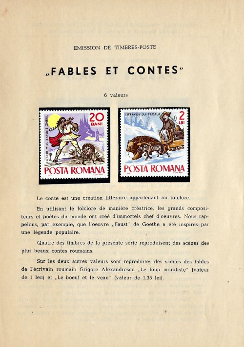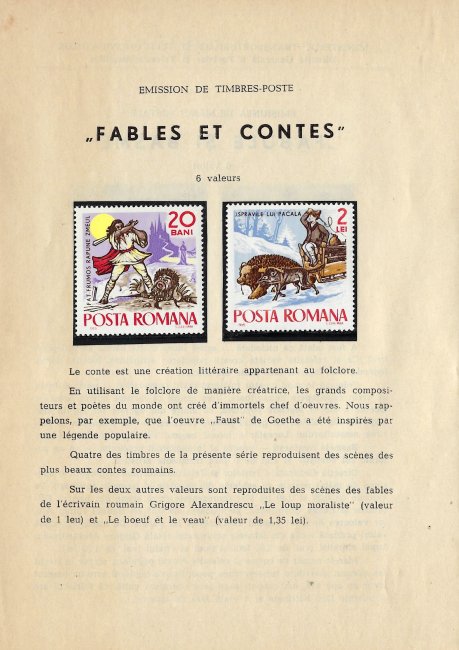 Beautiful stamps. I am hard pressed to see a fable in my sense among these six, but I do notice a wolf with a sheepskin. Pages in Romanian, French, and English. The text says that there are Two fables from Grigore Alexandrescu “Le loup moraliste” and “Le boef et le veau.” I keep this in the collection in case I am missing something. Maybe a future fable inquirer will find fables here.