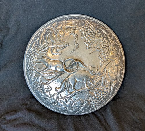 The verso actually reads "Aesops fables by Arthur Court copyrighted 1984." The tray depicts foxes with a tailless fox at the center. There is a grape and leaf border design. A curiosity of this tray is that its obverse underneath the tray depicts the scene as exactly as the top of the tray does. The same tray seems to be selling on eBay these days for several hundred dollars. Click on either picture to see an enlarged picture.